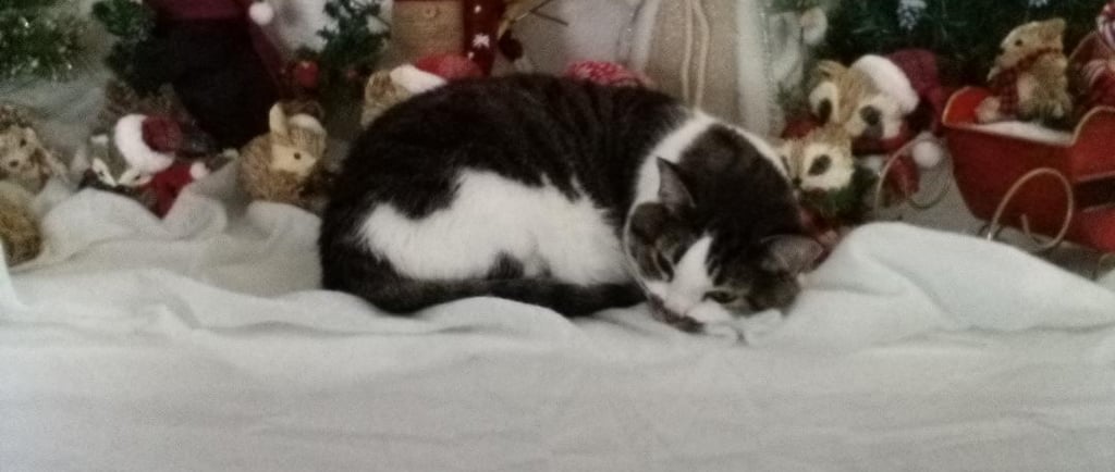 Wishing all my readers a Merry Christmas. Auntie says one of her favorite Christmas sights is seeing me sleep under our family Christmas tree.