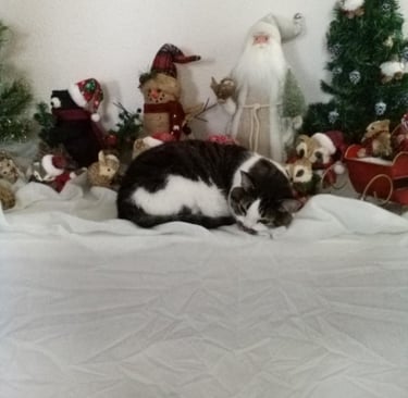 One thing I remember about Christmas is that it happens about every so often. My family does this, I think, every year. These crazy people put up a plastic object and call it a tree. I always thought trees were to be climbed on by cats. I guess I was wrong because that thing would not hold my weight, and I’m a nine-pound mini-kitty. The only place safe for me was sitting on a piece of cloth they called a tree skirt. I still haven't figured out how a skirt can fit a tree, but it is cool to snooze under that contraption.